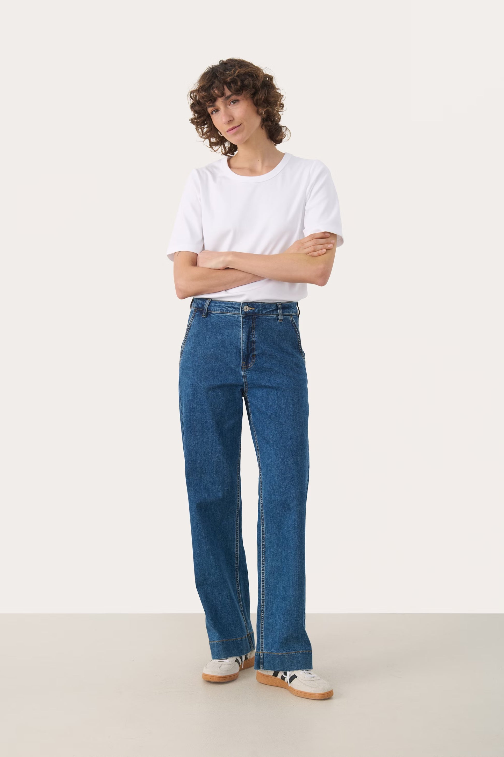 Modellen er 178 cm høj og er iført en størrelse 28. Disse jeans med vidde ben og højtaljet pasform har et cool og afslappet udtryk. De brede ben skaber en flatterende silhuet, mens det klassiske denim giver et tidløst look. Style dem med en enkel T-shirt eller skjorte for et ubesværet hverdagsoutfit.