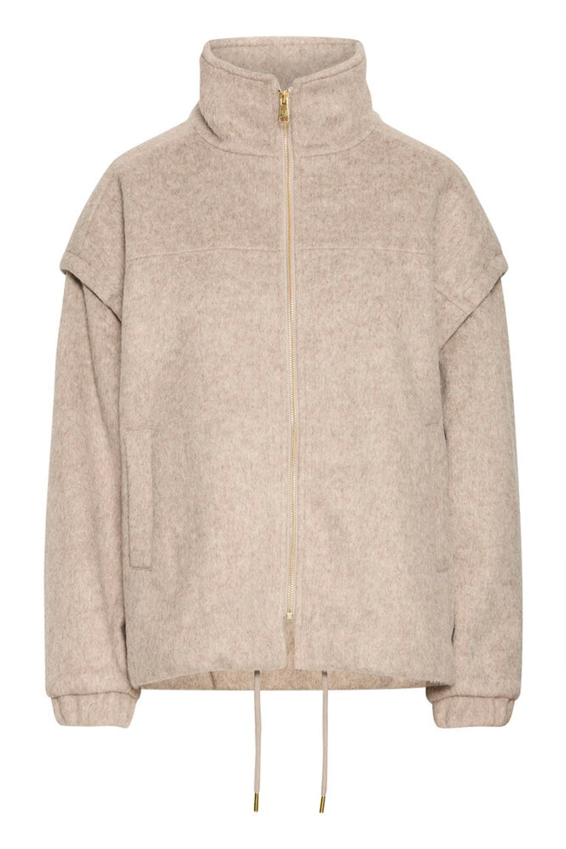 Denne afslappede jakke har en løs pasform, høj hals og lynlås. Sænkede skuldre, elastiske manchetter og snøre gør den ideel til hverdag og lag-på-lag.