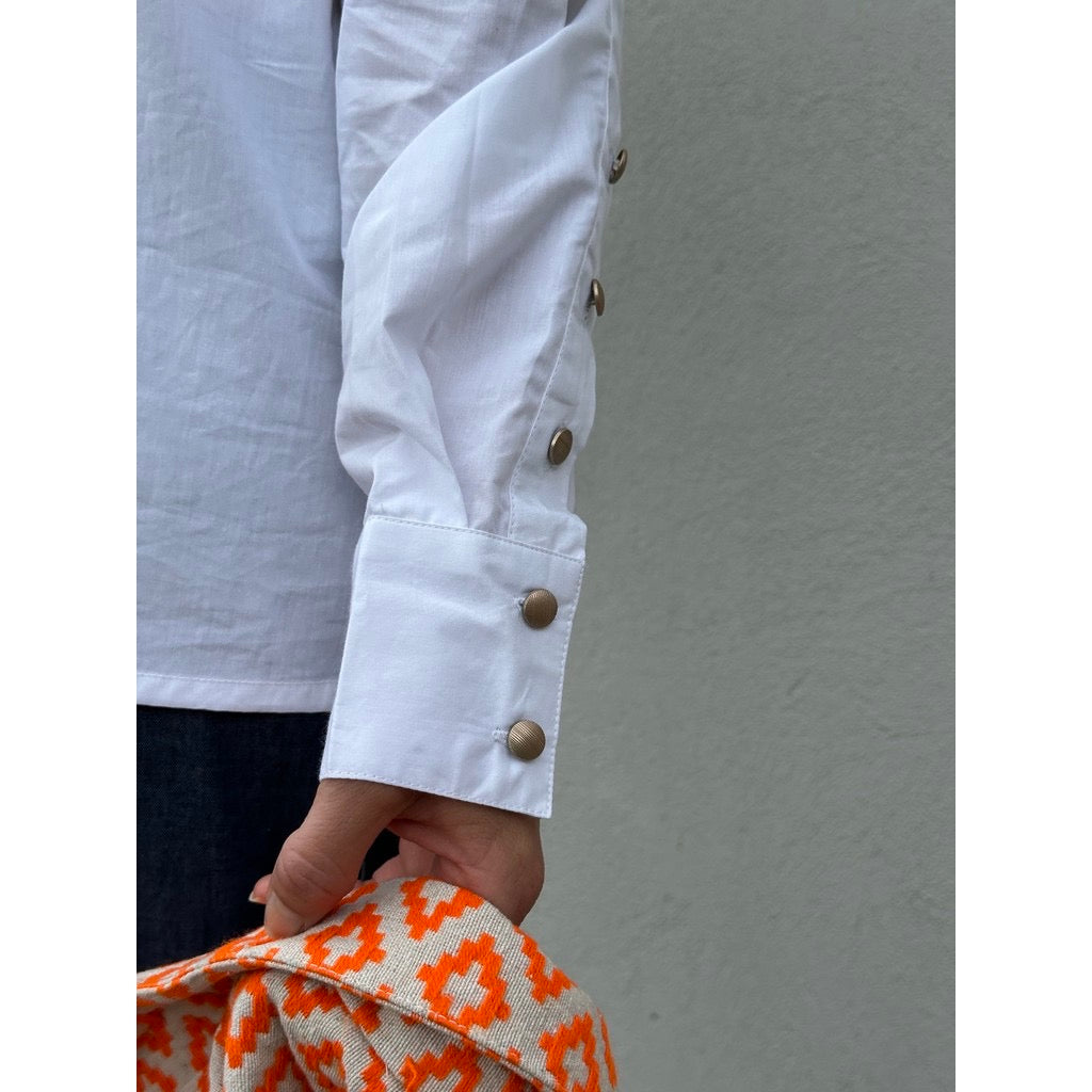 En smuk og klassisk skjorte med skjult lukning, der giver et rent og sofistikeret udtryk. Ved halsudskæringen og på ærmerne finder du matte guldknapper, som giver en elegant kontrast og tilføjer finesse. Ærmerne har en lang åbning med fem knapper i lukningen – en superfin detalje, der skaber et unikt look.