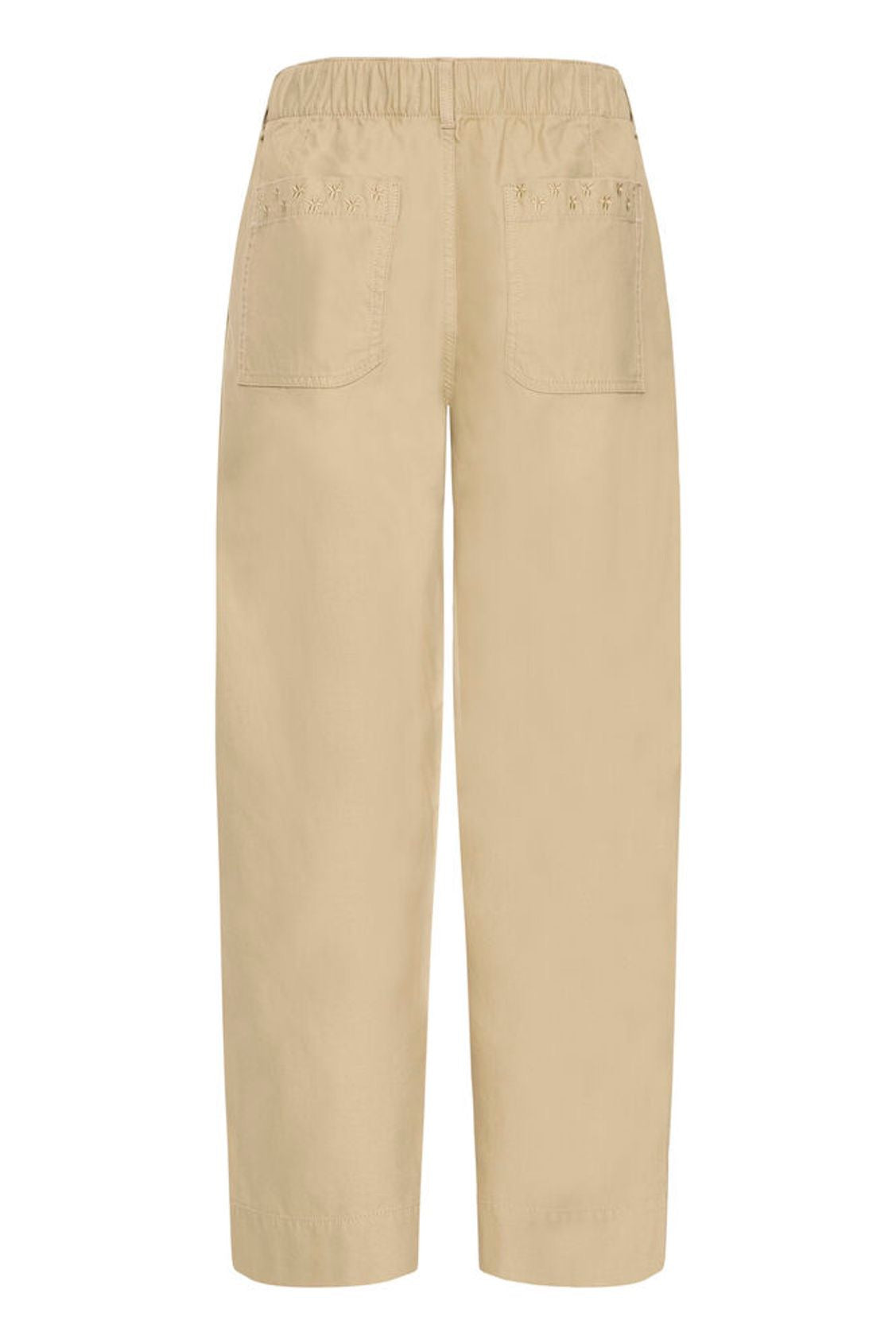 Ret skøn buks i canvas bomuld med store lommer og på baglommerne er der påsyet stjerner, der er elastik i taljen.