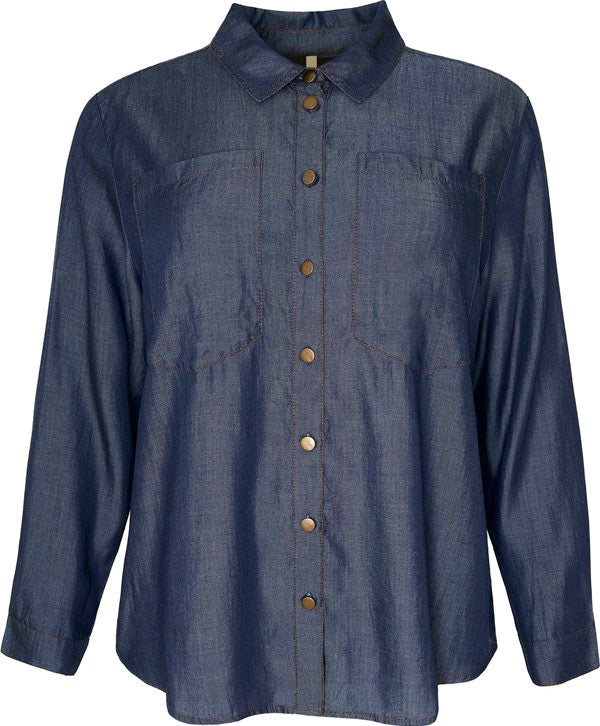 Blød og let tencel-skjorte i en smuk denimblå nuance. Det klassiske snit med knaplukning og brystlommer giver et afslappet, tidløst look, der er perfekt til både hverdag og arbejde.