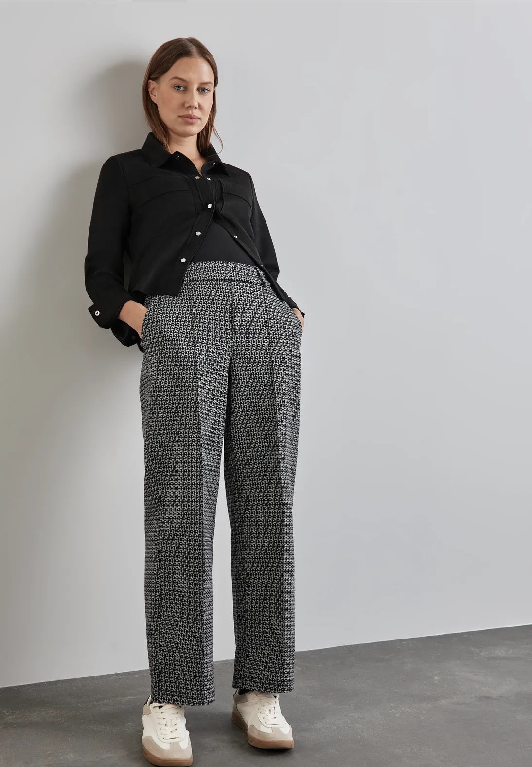 Jacquardbukserne fra Street One til kvinder i en afslappet pasform er et rigtigt blikfang. Det høje taljesnit og lige ben skaber en moderne silhuet, mens sidelommerne og bæltedetaljen med knapper tilføjer stilfulde accenter. Materialeblandingen med stretch giver dig optimal komfort og fleksibilitet.