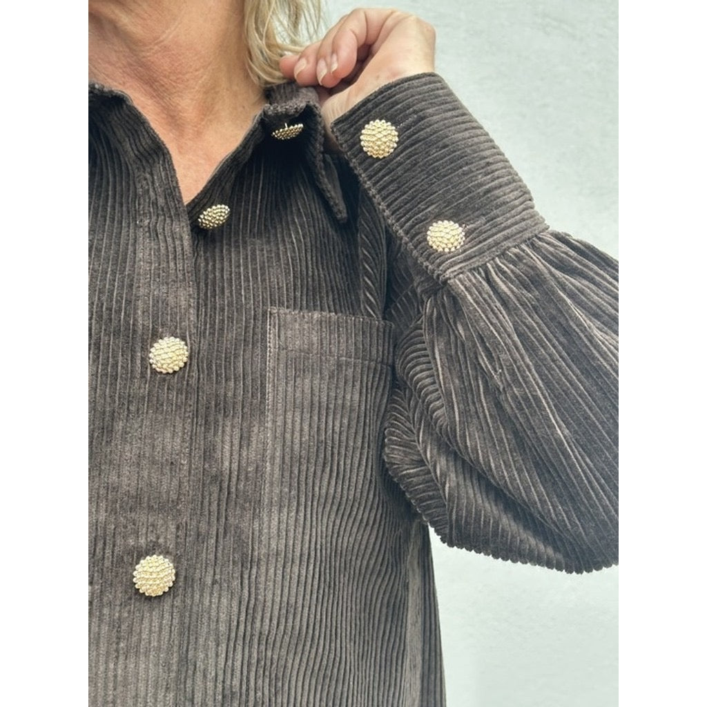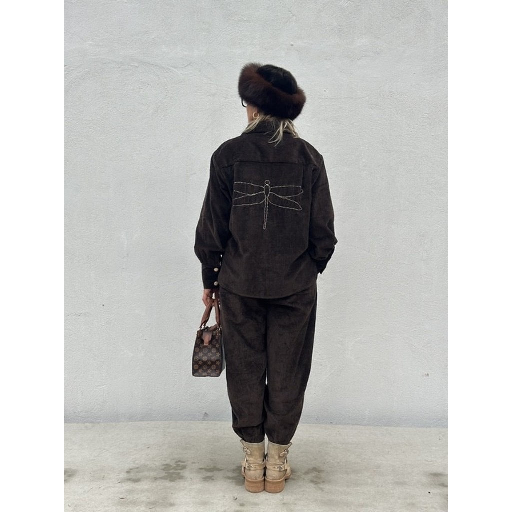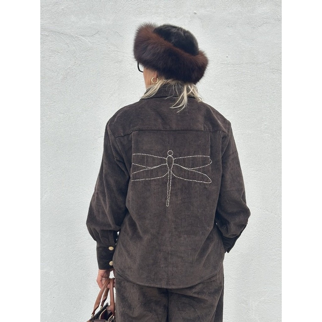 Blusen lukkes foran med smukke guldknapper, der tilfører et elegant og sofistikeret touch. På ryggen har den et stort guldlogobroderi, som gør designet unikt og iøjnefaldende – et ægte statement-piece i garderoben.