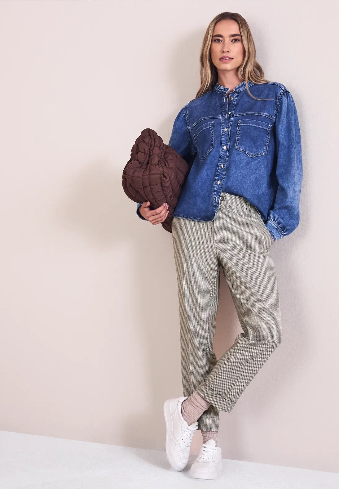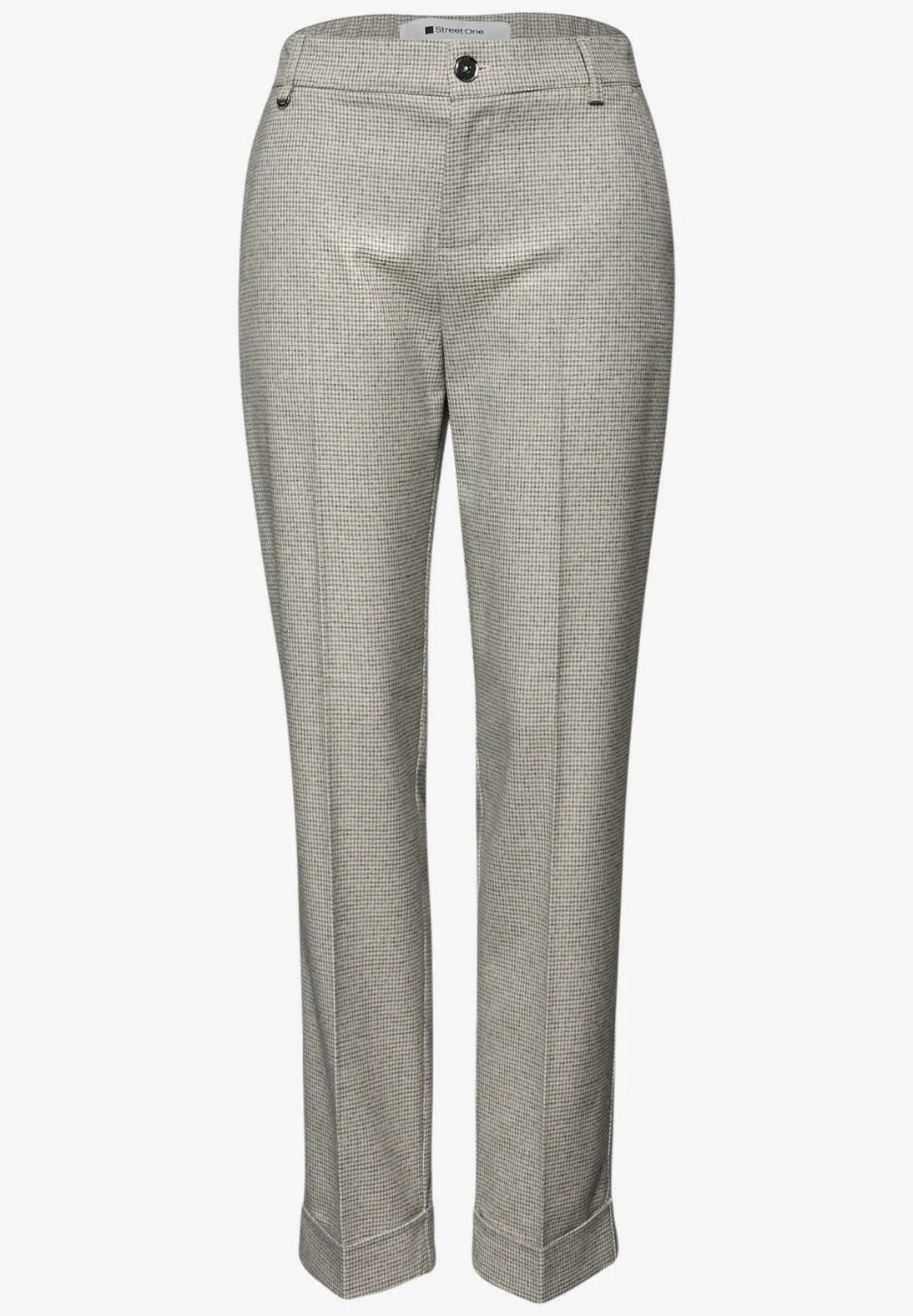 Med sit trendy houndstooth-print giver disse smalle bukser fra Street One dit outfit et frisk touch. Opsmøgsdetaljer ved benåbningerne skaber et afslappet look, mens den elastiske linning bagpå og det strækbare stof giver exceptionel komfort. Den smalle pasform er perfekt til at skabe feminine, strukturerede looks.