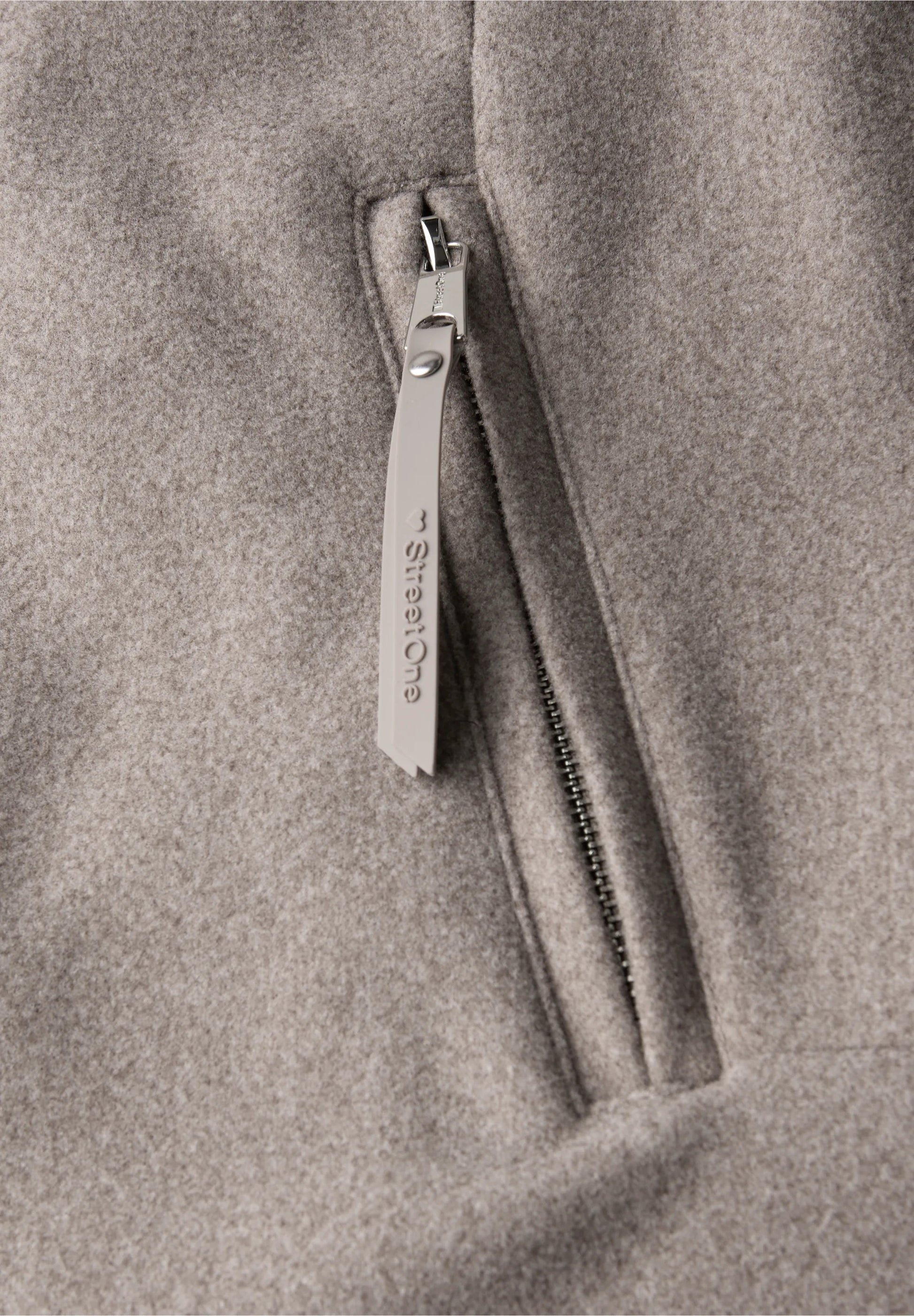 Denne damefrakke fra Street One kombinerer klassisk elegance med moderne detaljer. Strikelementer på den opretstående krave tilføjer et stilfuldt accent, mens uldlooket skaber et look af høj kvalitet. Sidelommer med lynlås og en gennemgående knaplukning gør den til det perfekte overgangsstykke.