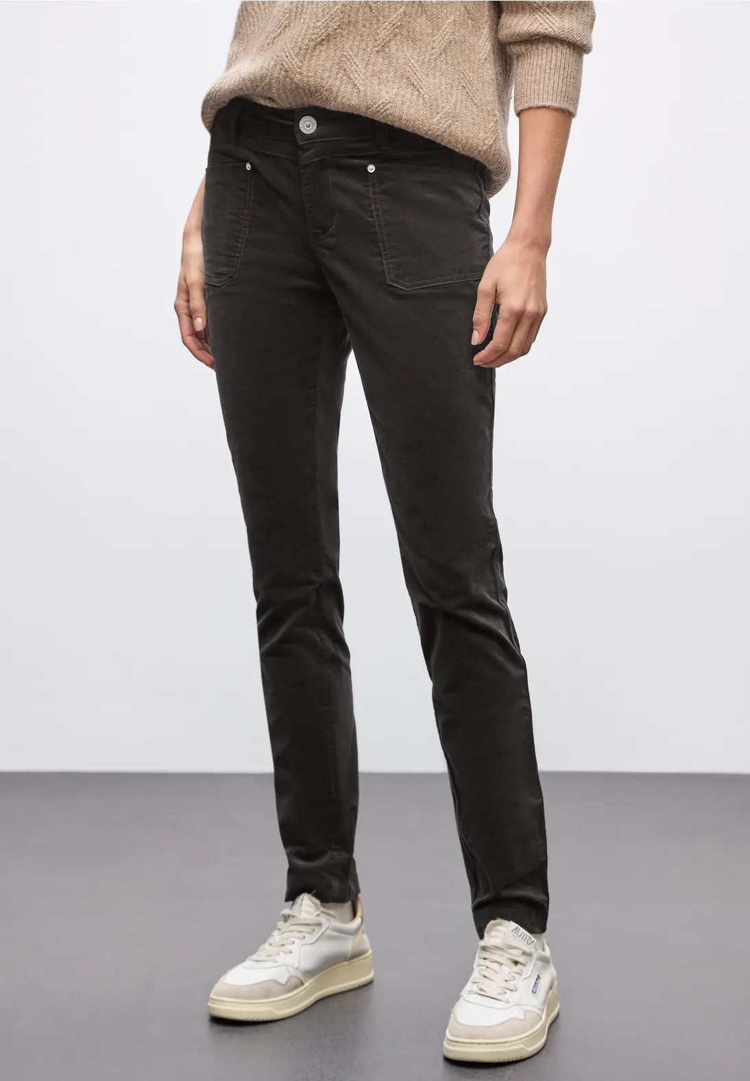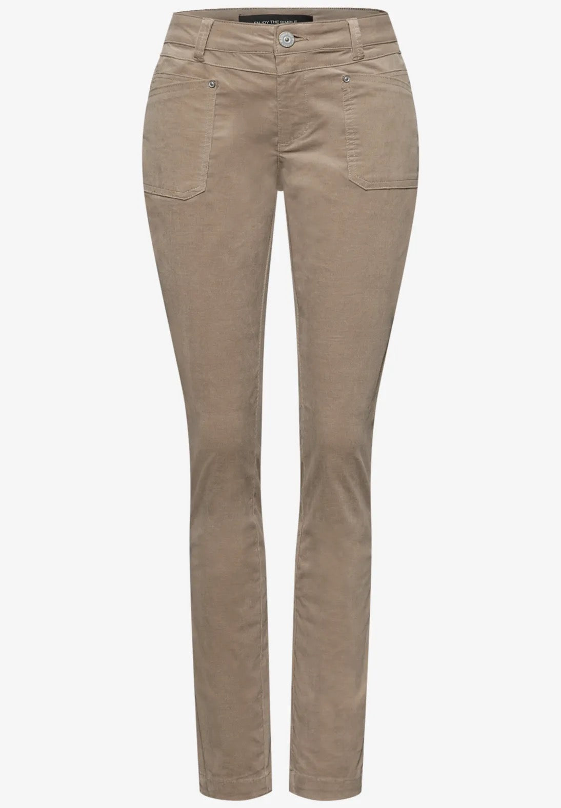 Street Ones Yulius-inspirerede corduroybukser til kvinder imponerer med deres bløde fornemmelse og moderne snit. Den mellemhøje talje og de slanke ben skaber en feminin silhuet, mens påsyede lommer tilføjer et afslappet look. Det bløde corduroystof med stretch giver overlegen komfort hele dagen lang.